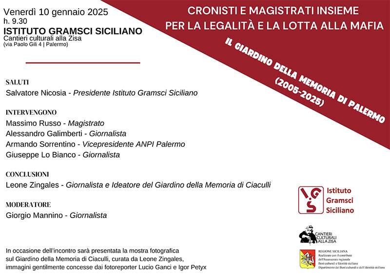 Contestualmente al convegno sarà presentata la mostra fotografica “IL GIARDINO DELLA MEMORIA DI CIACULLI” a cura di Leone Zingales con immagini concesse dai fotoreporter Lucio Ganci e Igor Petyx.